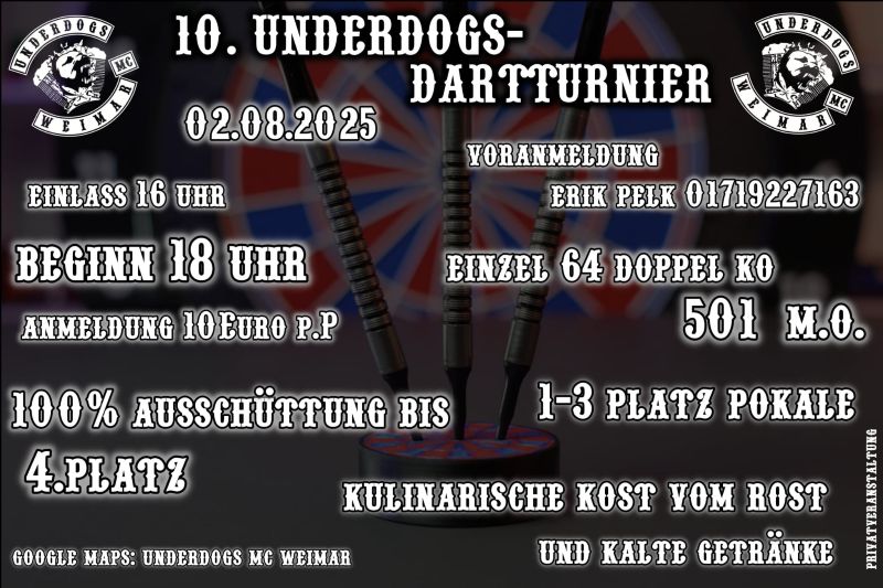 Der Underdogs MC Weimar lädt zum 10. Underdogs Dartturnier am 02.08.2025 ein.